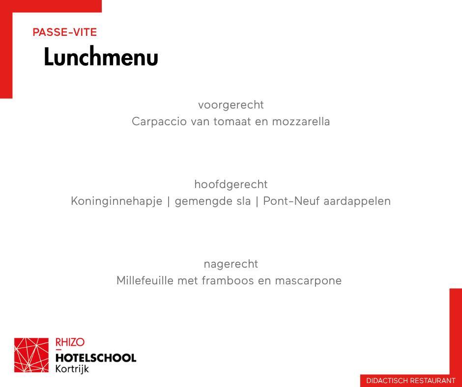 Wij stellen je graag onze Lunchmenu voor. Onze leerlingen van het vierde jaar maken zich klaar om jullie te ontvangen! Lunch te verkrijgen op 13 - 14 - 20 en 21 oktober.
